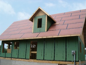 We use Zipsystem™ for roof and wall sheathing. This system is easy and quick to install and eliminates the hassles of using H-clips, felt, and housewrap. The panels (red for roof and green for wall) provide superior moisture control and improved air barrier performance. The system has a 15-year warranty and the panels have a 30-year warranty. For more information, please contact us or visit the Zipsystem™ website.